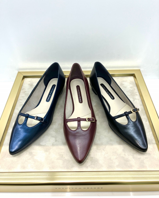 小さめのTストラップが上品なラインを演出。