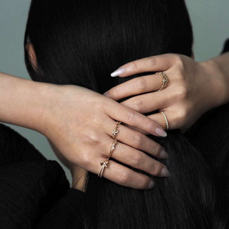 地金と小さなダイヤモンドの端正な表情は、どんな装いにも自然に馴染みながら、ほのかな気品を指先に添えてくれます。