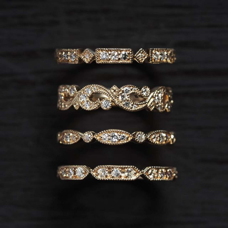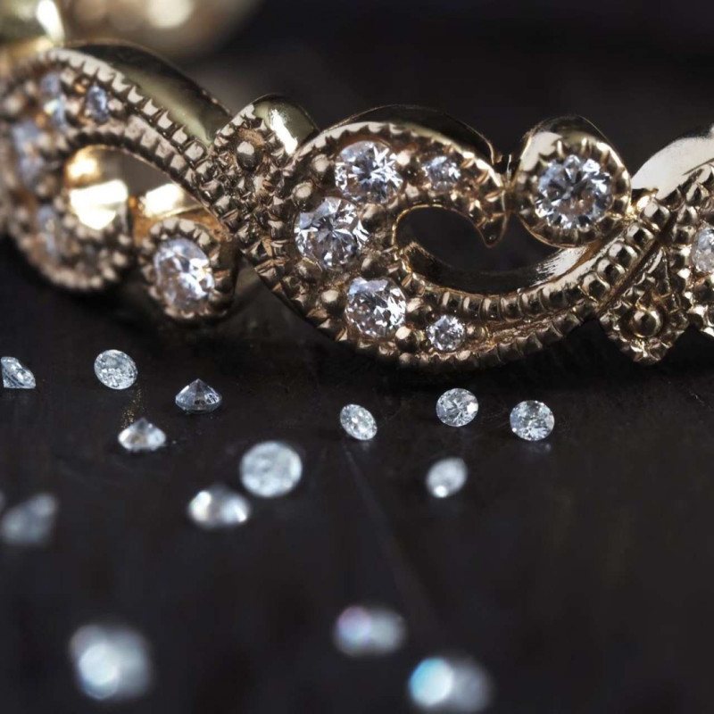 デザインによって爪留めとミル留めを織り交ぜ、豊かな表情を作り出しています。
