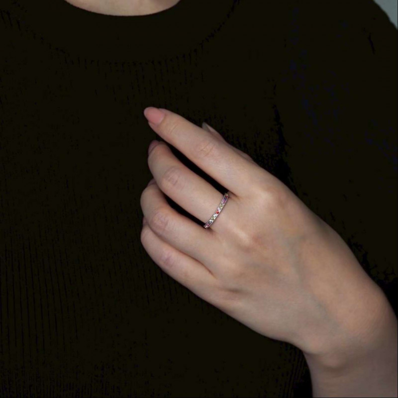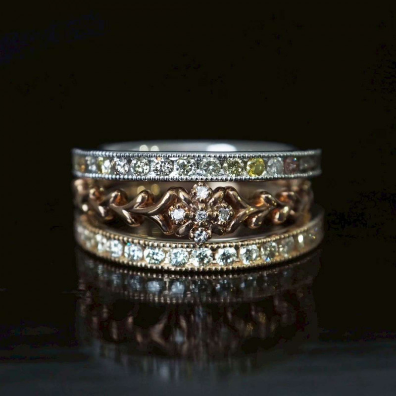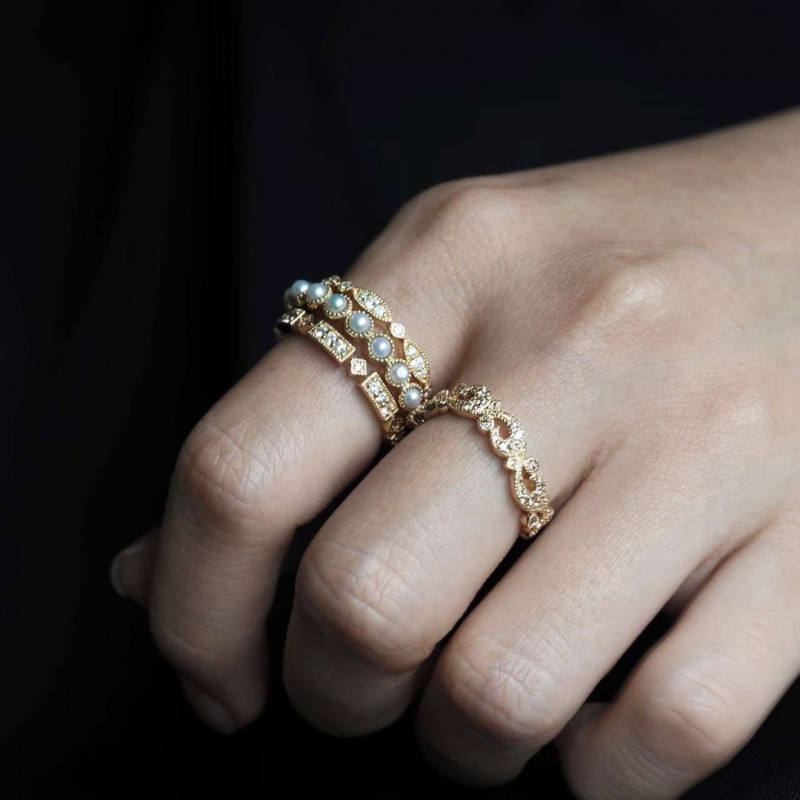 カラーストーンのリングと重ねても、お互いを引き立て合い華やかにまとまります。