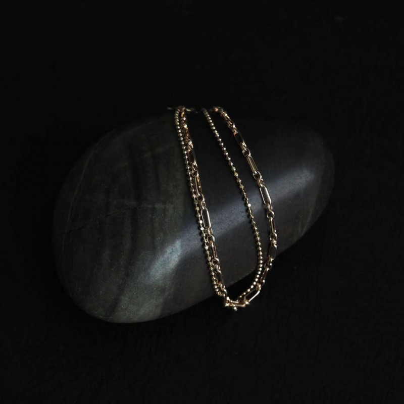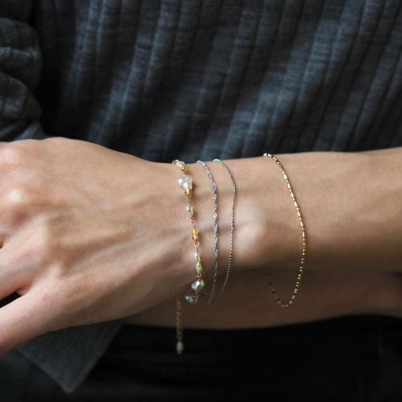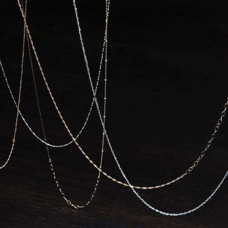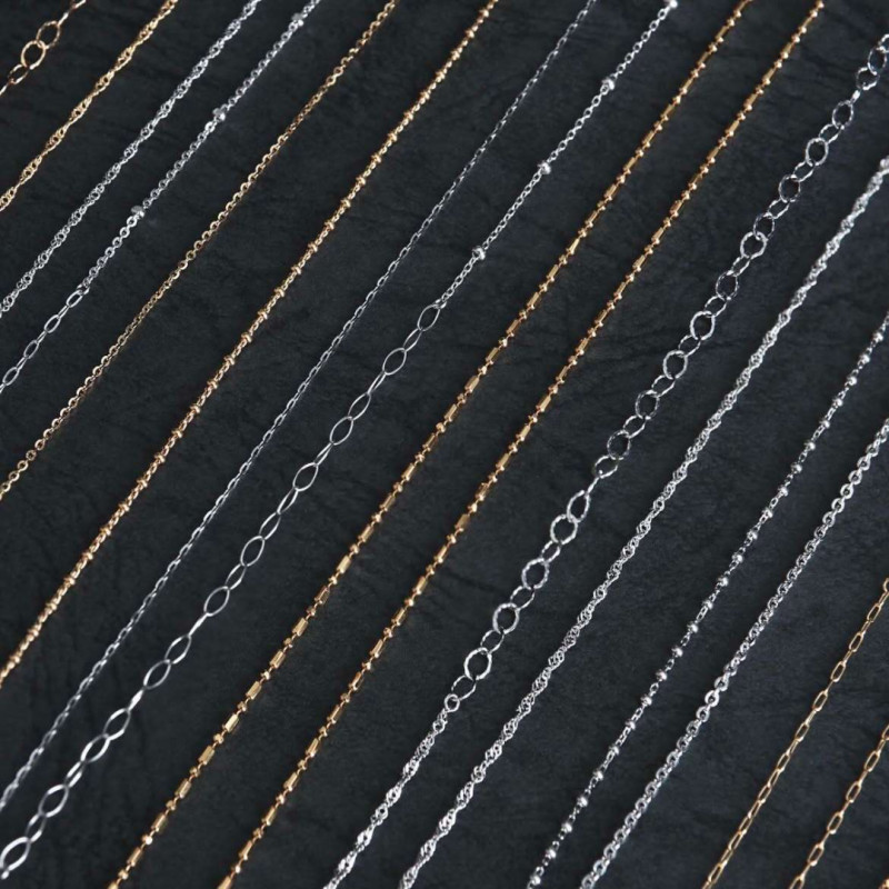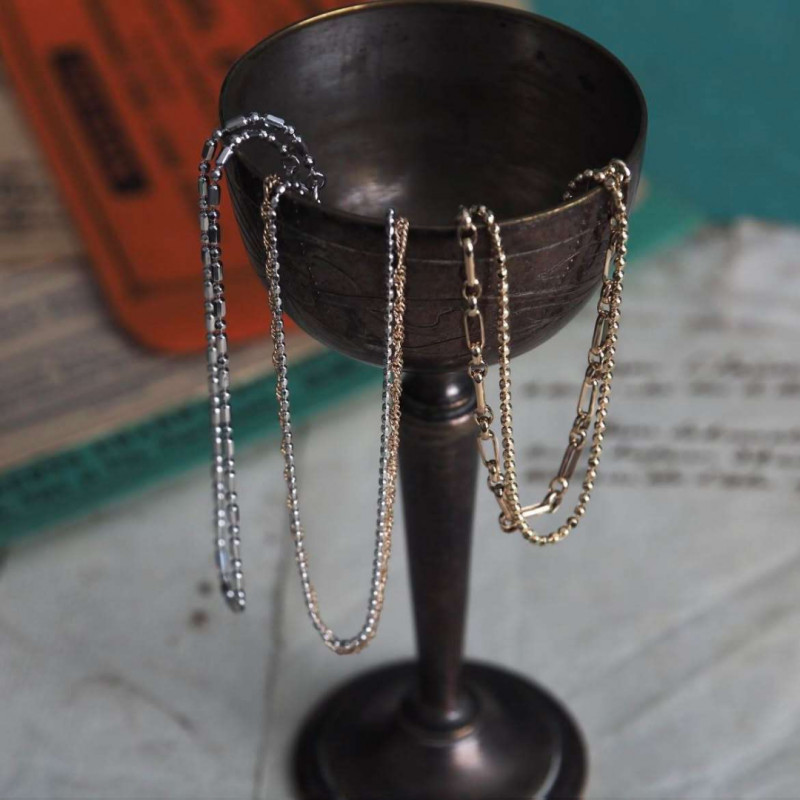 煌めきの強いデザインを活かし1種類で仕立てたものや、2~3種類のチェーンを一本に繋げることで、目を引くアクセントをつけたもの。