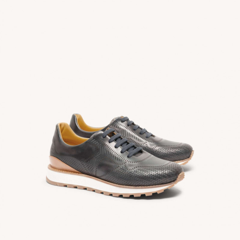 ブランドを象徴するこの一足は、カジュアルスタイルに独自の解釈を加え、洗練された印象を表現します。レーザーカットと型押し加工によって繊細に仕上げられたソフトカーフのアッパーは、まるでメッシュレザーのような軽やかさ。ホワイトとハニーをミックスしたトレッドラバーソールが、優れたグリップ力で歩行をしっかりサポートします。