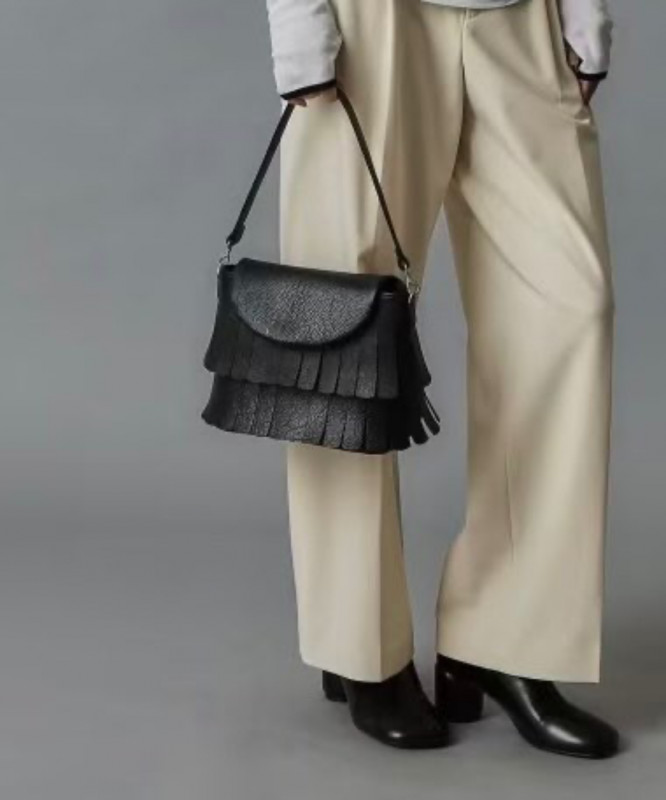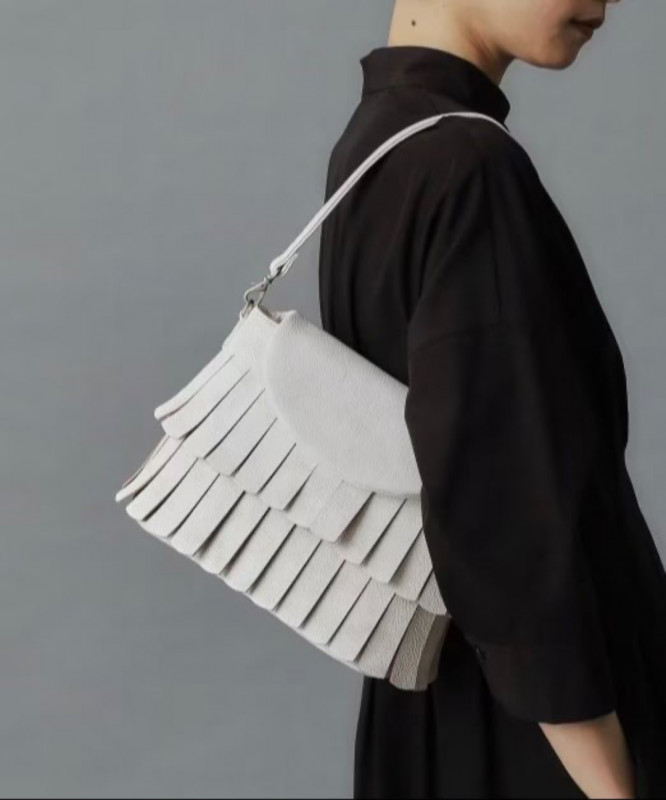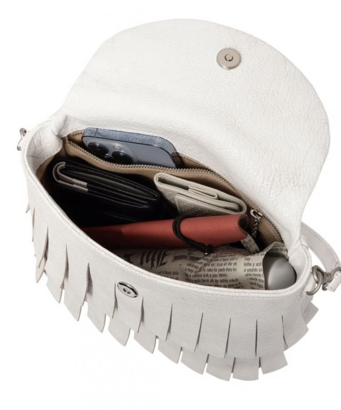 フリンジ部分はタンニンなめしのキップ(牛革)をシュリンク加工しています。