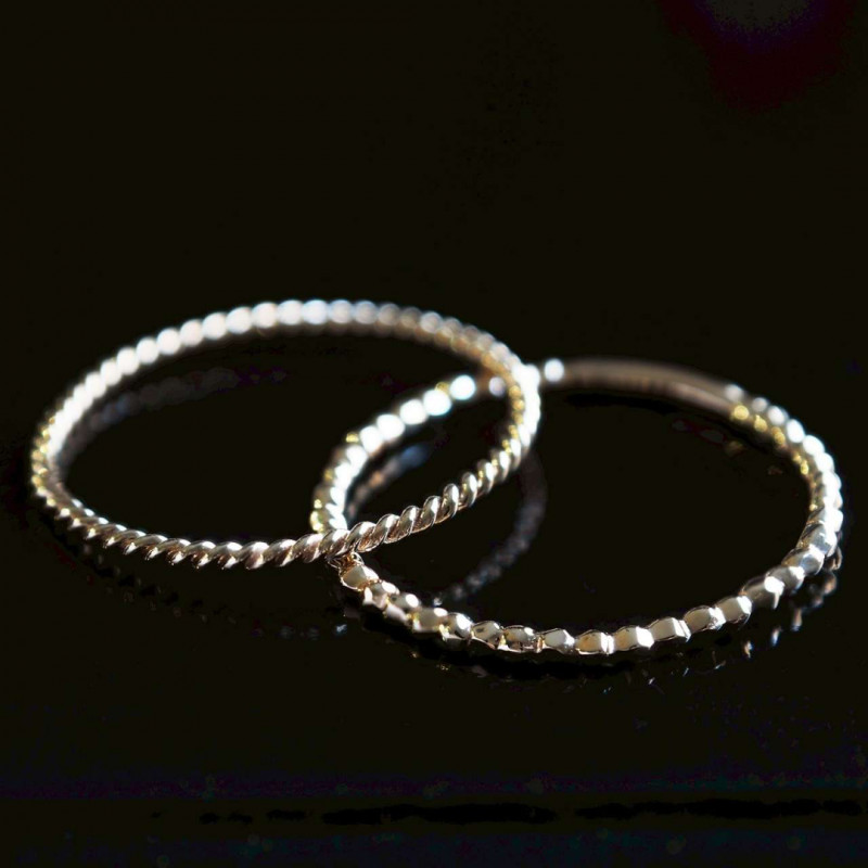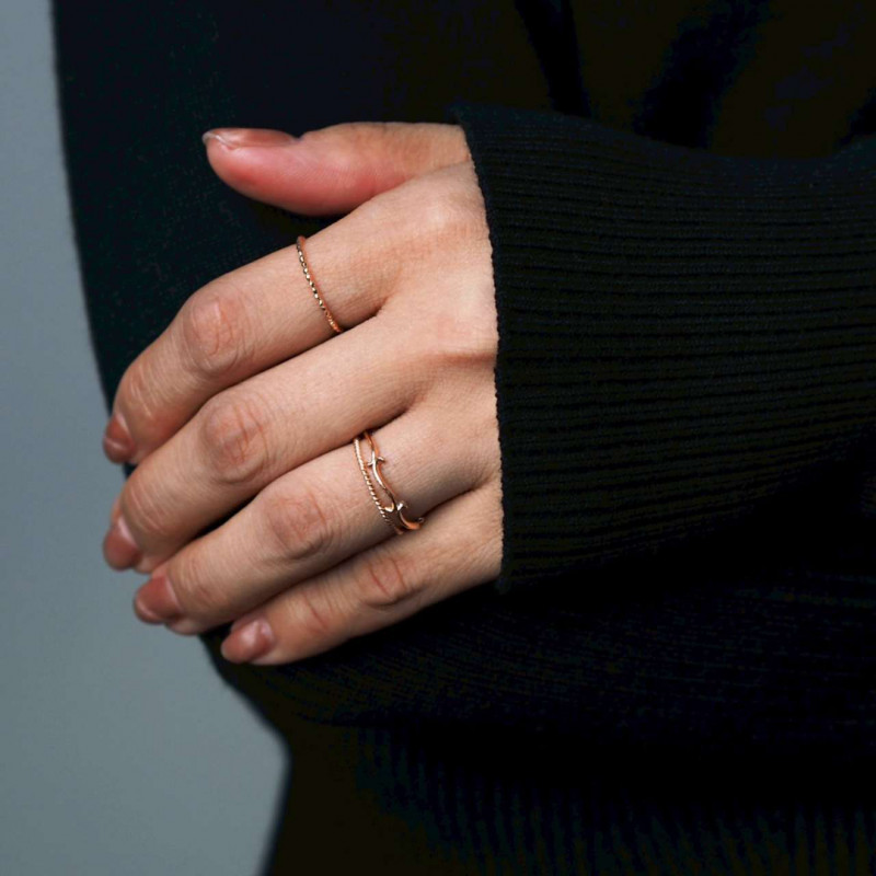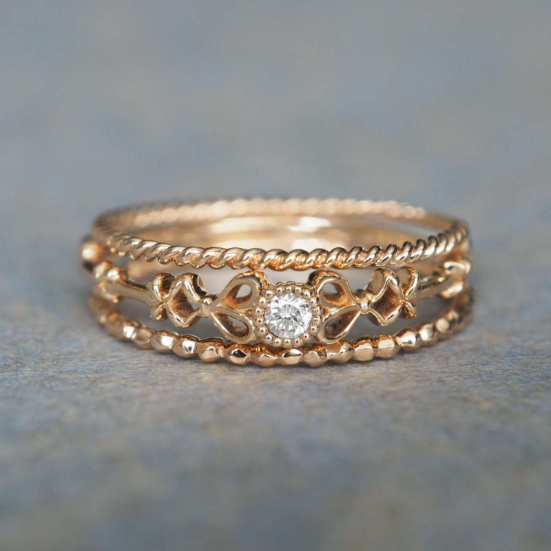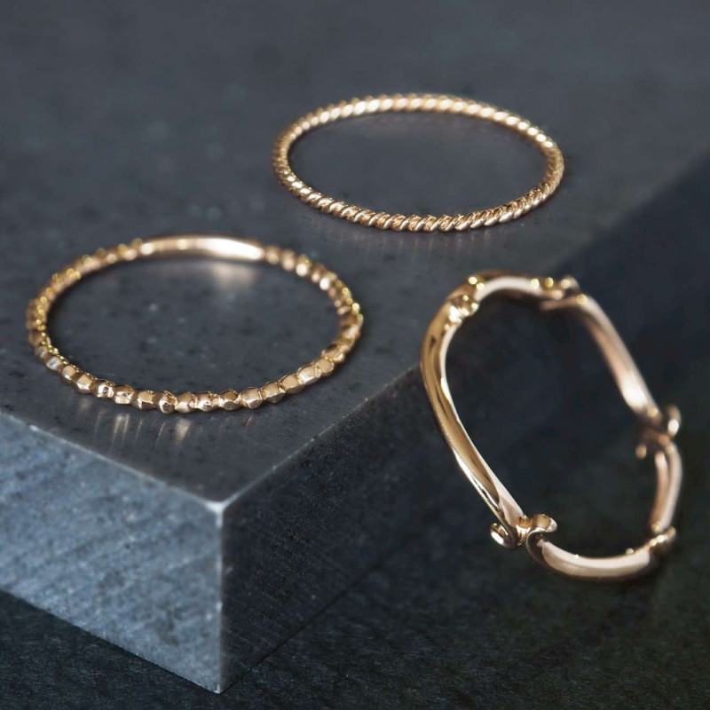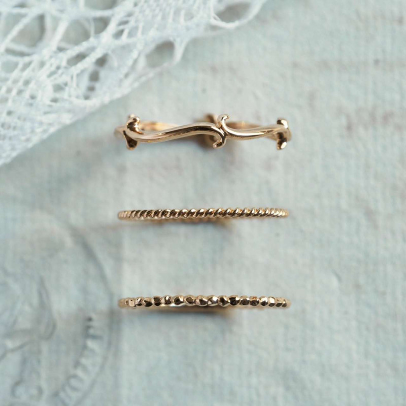 ロープのようなシルエットを一周入れたものと、小粒の石が一列に並んだデザイン、しなやかに伸びるツタ、さり気ない個性を宿した3種類のリングたち。