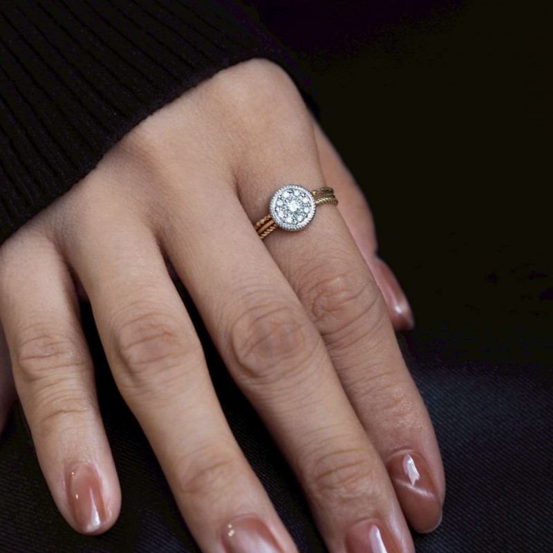 同じナチュールシリーズと重ねて、統一感のあるコーディネートを楽しむのはもちろん、ミルグレインなど細身のリングに合わせれば、ボリューム感とデザイン性がより高まった贅沢な手許に。