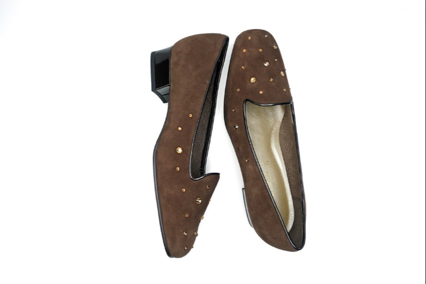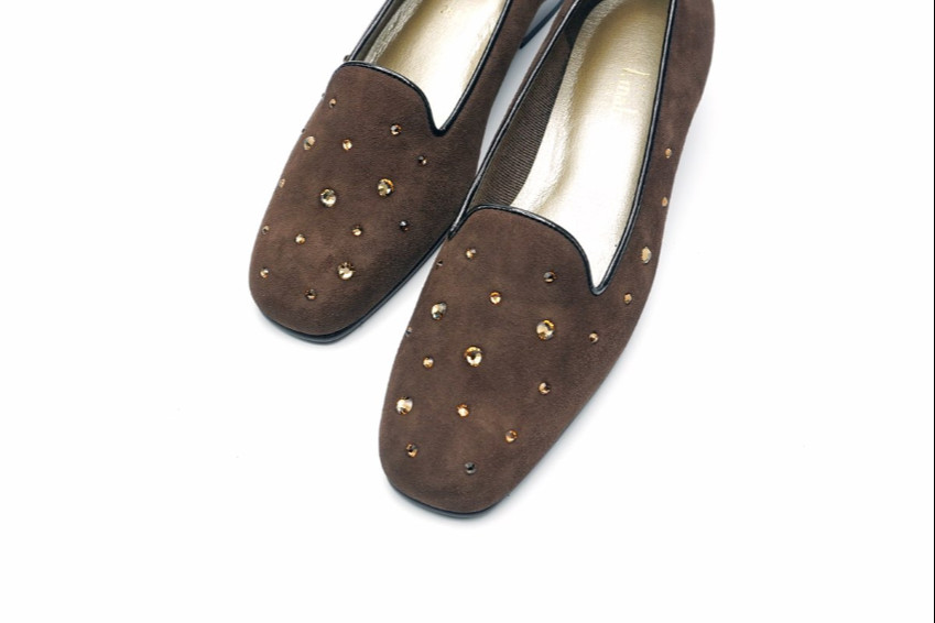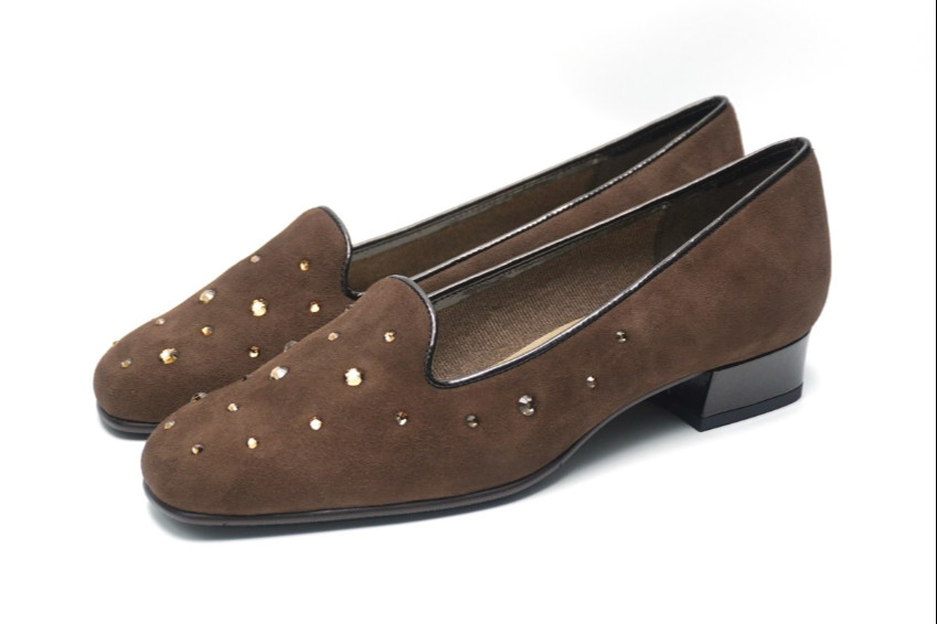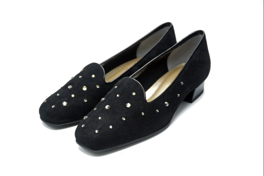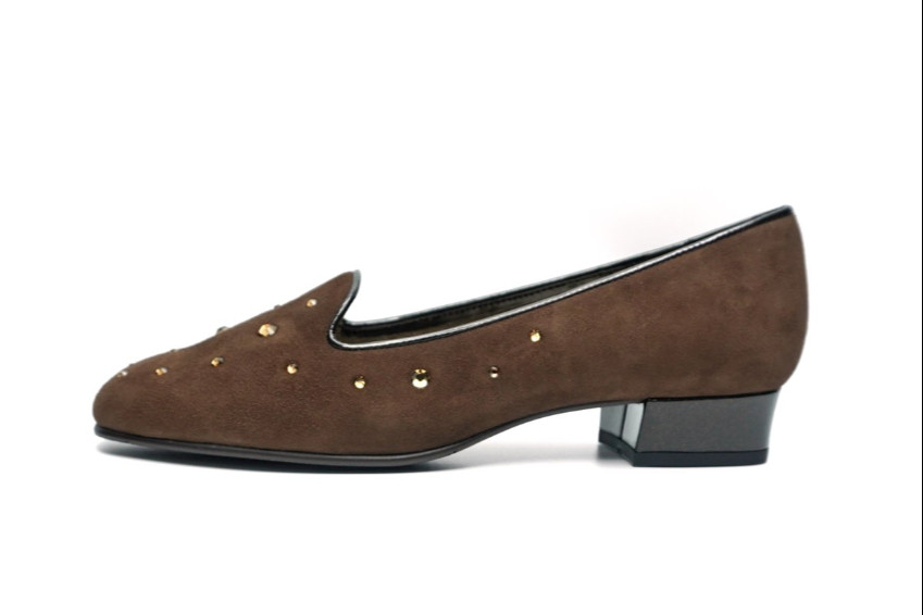 シープスエードにラインストーンを散りばめたオペラパンプスです。