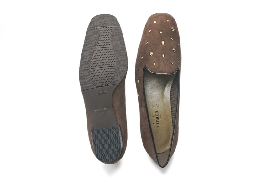 柔らかでマットな質感のスエードに、大粒、小粒とサイズの異なる同色系のラインストーンをバランス良く配置しました。
