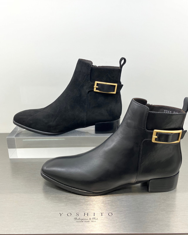 見映えスッキリなゴールドのバックルをアクセントに、お洋服に合わせやすいスムース素材のブラックと優しい印象を与えるスエードのブラックをご用意しました。