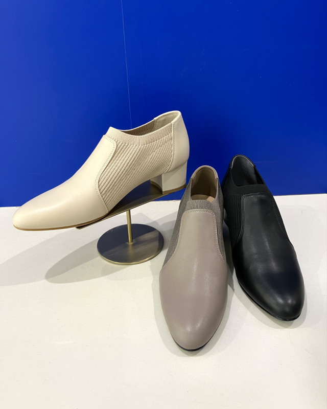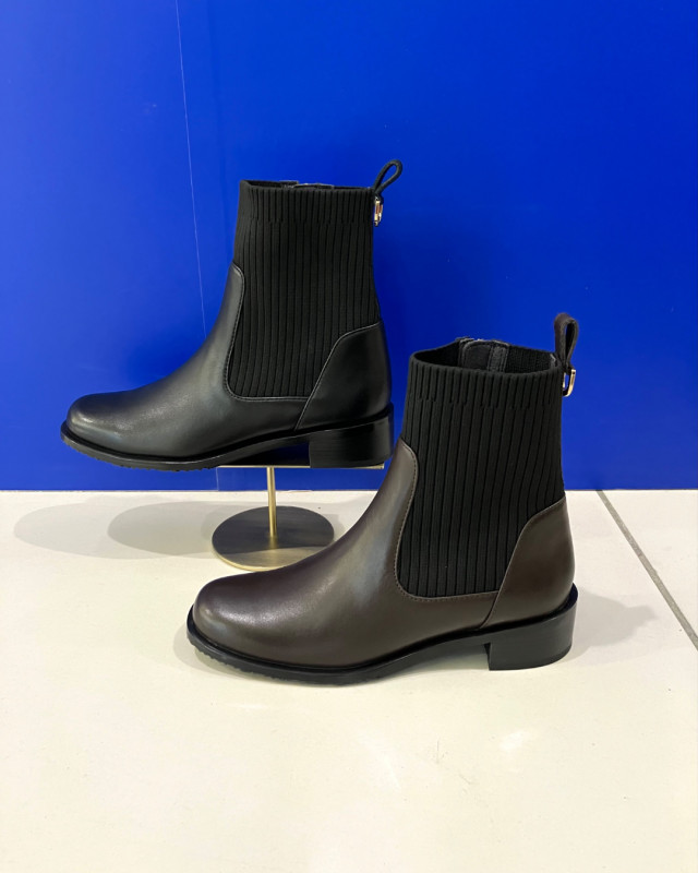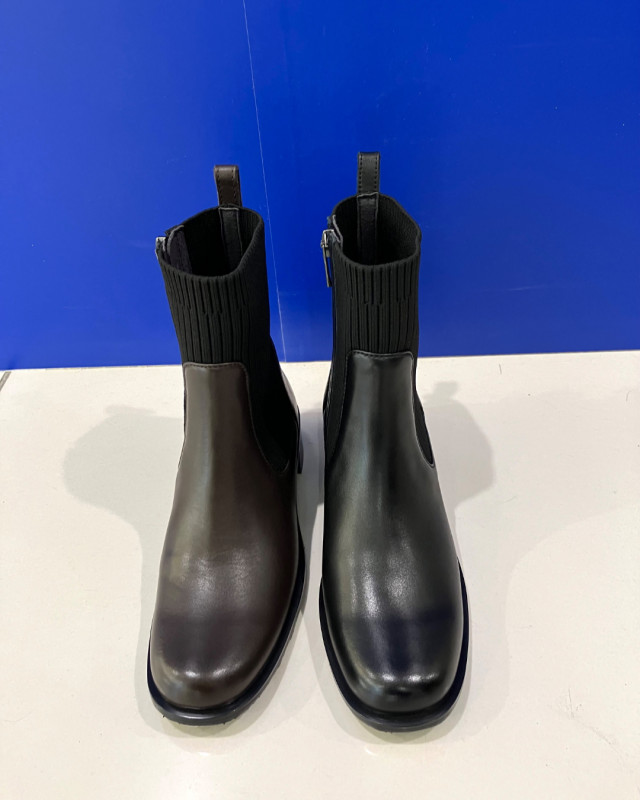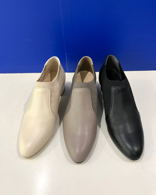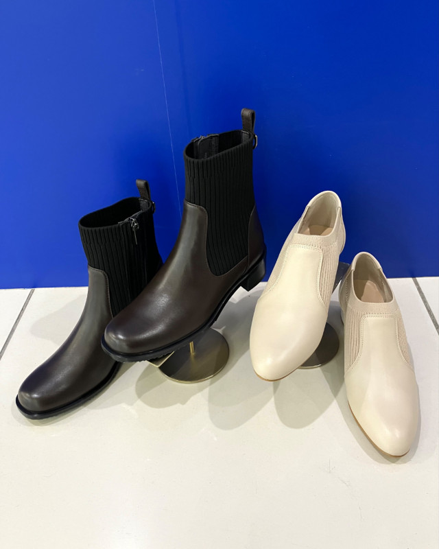 ニット×革の異素材ブーツとシューティのご紹介です。革とニット素材の切り替えがオシャレ。