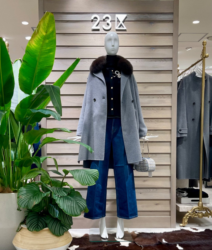 MANTECO ウールリバーコートにファーティペットやベロアニットを合わせた華やかなムードのコートスタイルを提案いたします♪