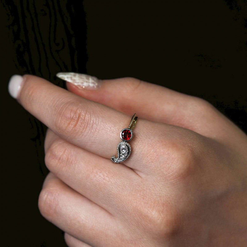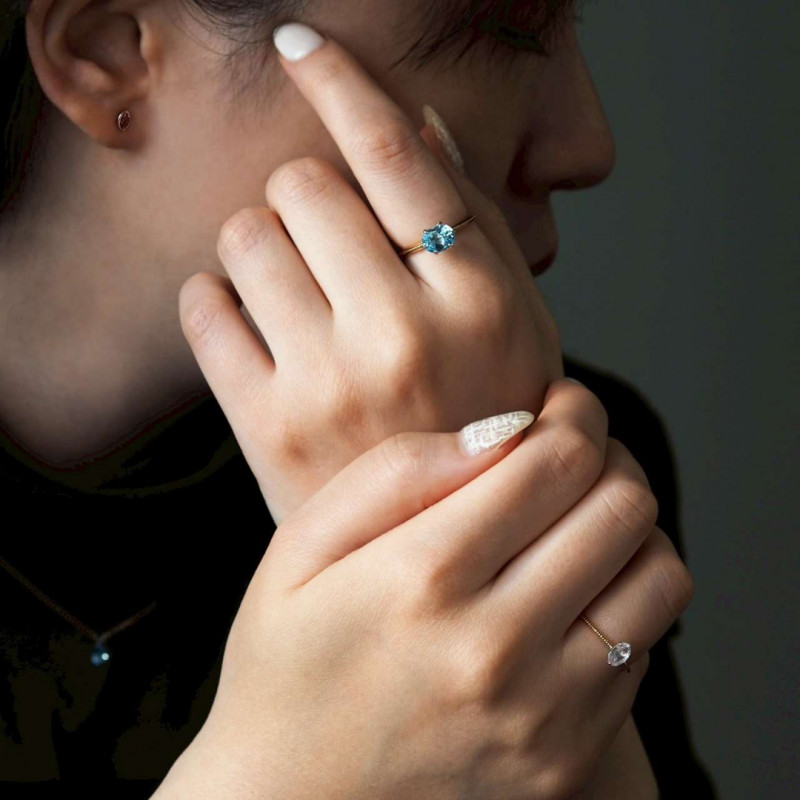 ペアシェイプを留めたリングを、縦向きと横向きで組み合わせて重ねれば、指先に星が輝くような装いが完成します。