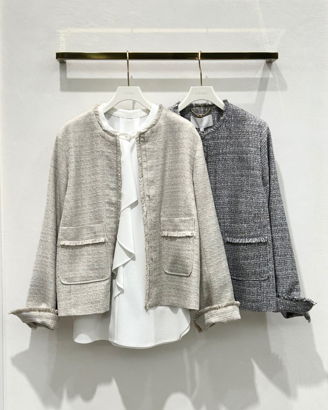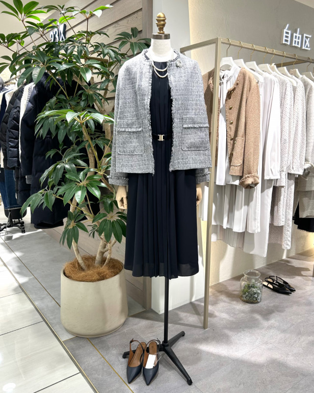 上品なツイードジャケットにサテンワンピースを合わせた大人のきれいめスタイル。