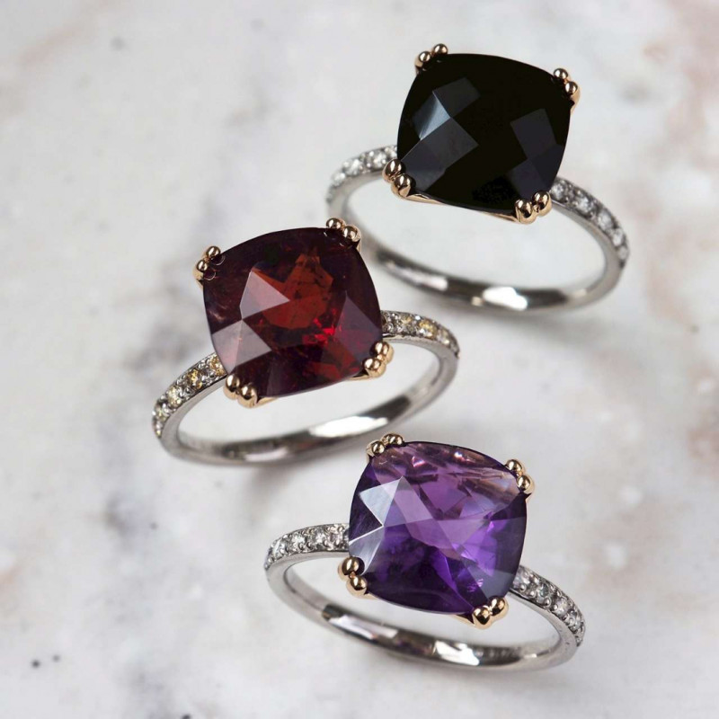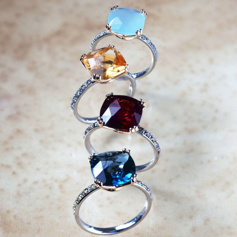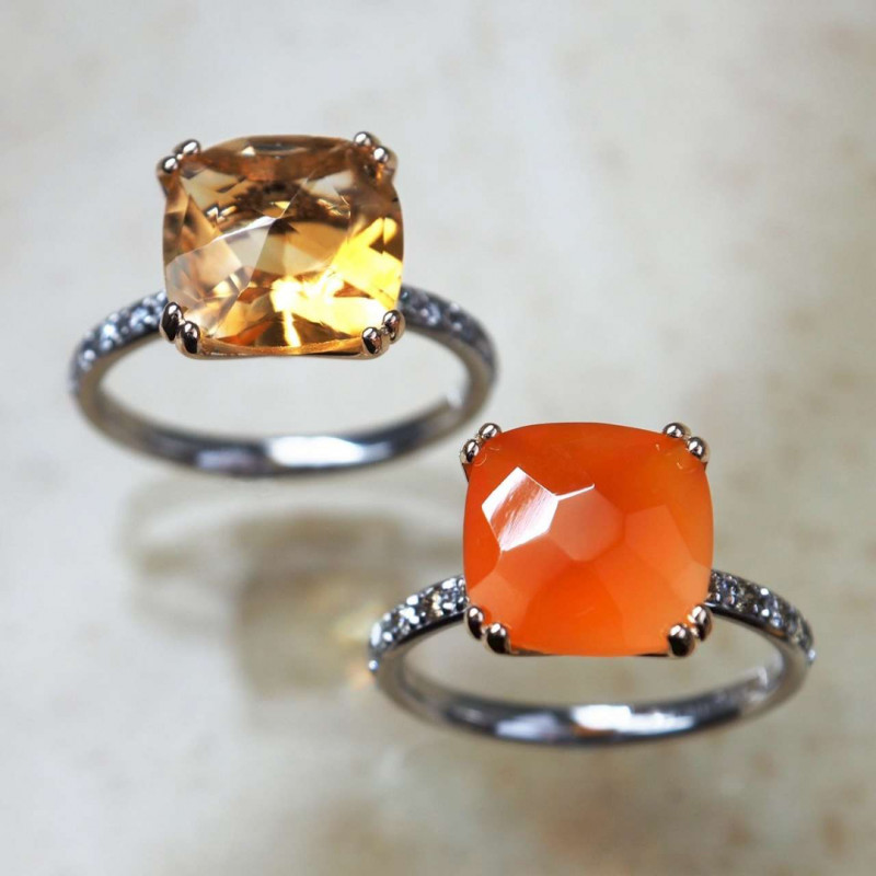 シラーが美しいムーンストーンや、大人の魅力溢れるガーネット、ビタミンカラーが眩しいシトリンやカーネリアンなど、色とりどりの宝石であつらえました。