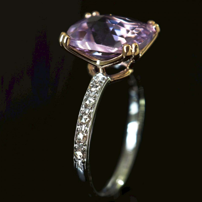 透明感をたたえたローズアメシストは、まるで鏡の中に続く世界のように、角度によって複雑に光を反射する様に惹き込まれます。