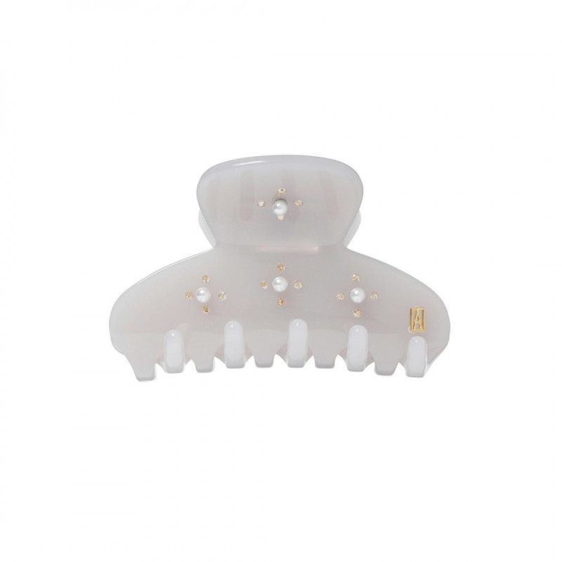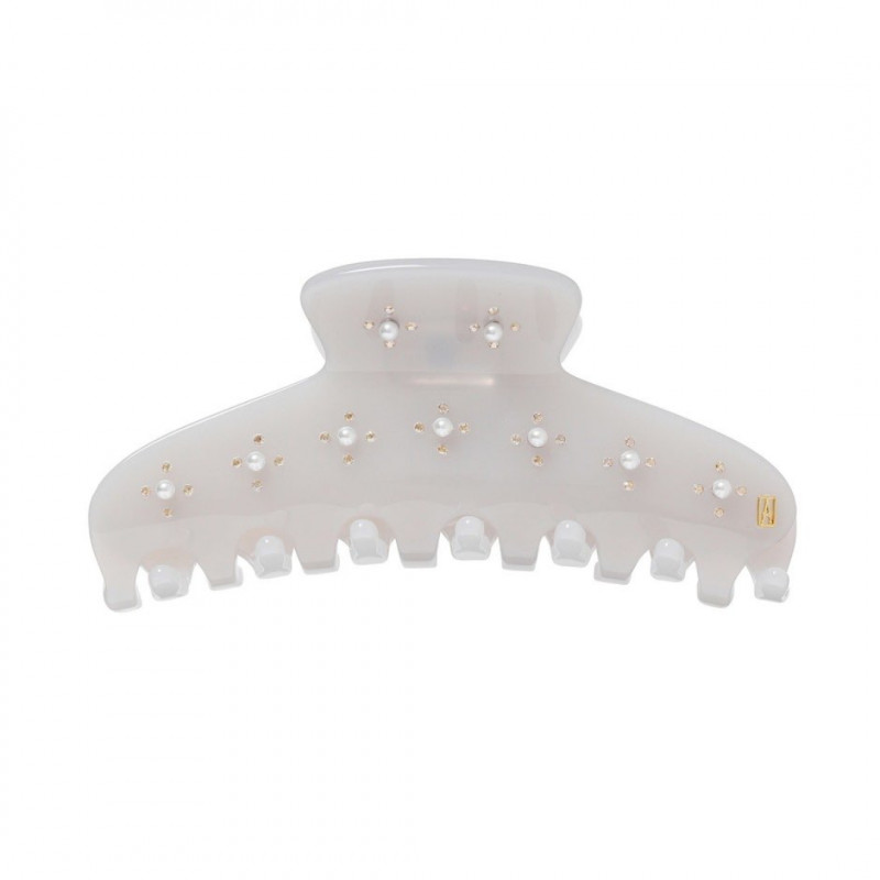 繊細なデザインと儚さを醸し出すカラーが美しいクリップ。淡い色にスワロフスキー®・クリスタルとスワロフスキー®・クリスタル パールを施した、雪の日を思い起こすような神秘的なデザインです。カラーが重くなる冬のコーディネイトに合わせたいアイテム。