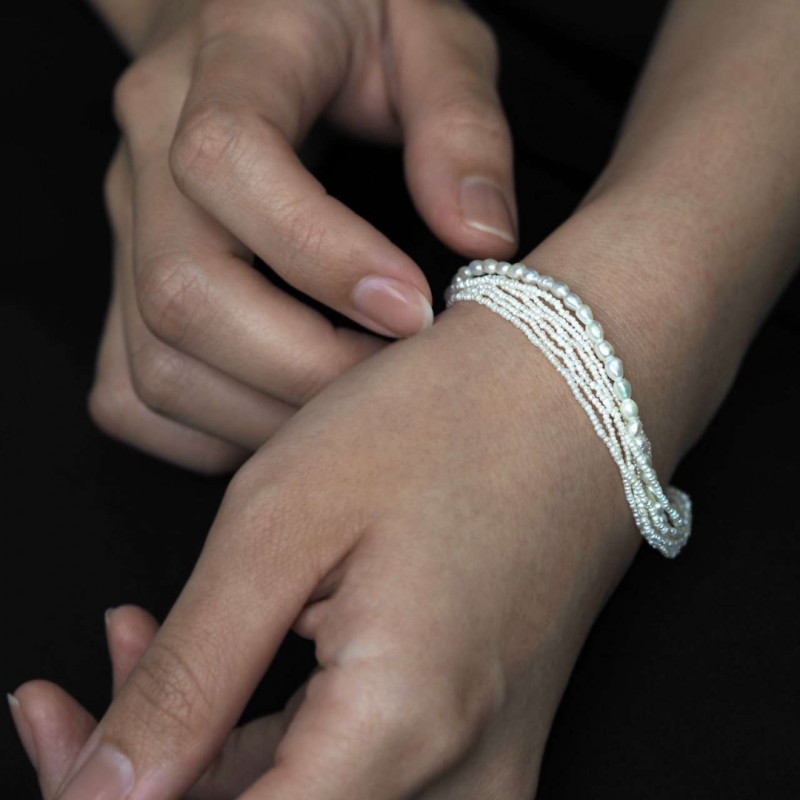 珠と珠がところどころで交差し、重なり合いながら、立体感と奥行きをふわりと描き出します。