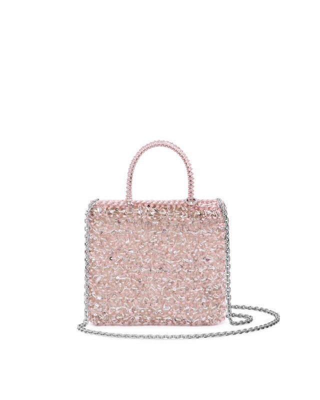 スパンコール、ビーズ、ワイヤーコード、それぞれ異なる光沢が重なり合い、角度によって豊かに変化する贅沢な輝きを楽しめるバッグです。
