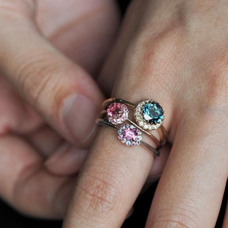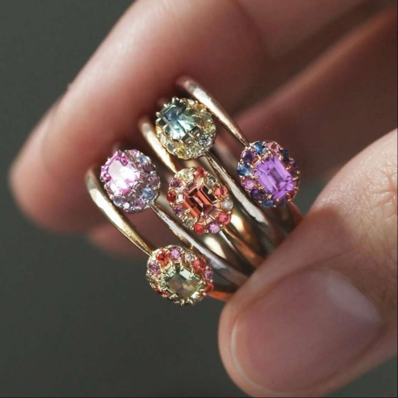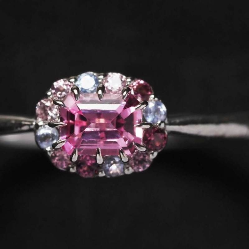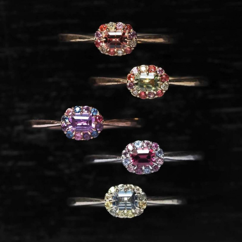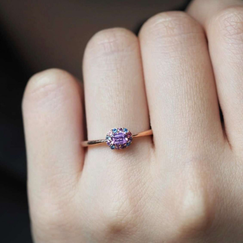4x3mmサイズのオクタゴンカットのサファイアをメインに留めた、愛らしい佇まいの指環。