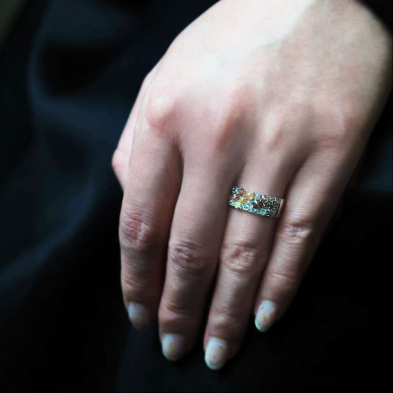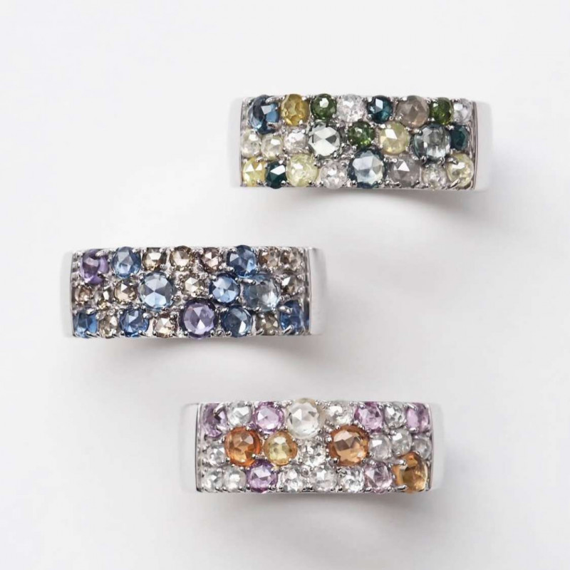 ロジウムプレーティングの白銀色に、瑞々しく潤んだブルーやピンク、グリーンの宝石を留めたリングは、春の風のような爽やかさをたたえています。