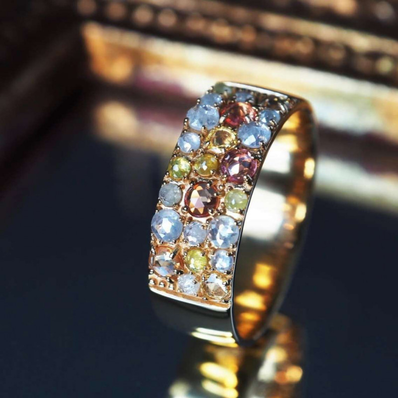 K18プレーティングならではのい黄金色の土台に、ブラウンやスノーホワイトのダイヤモンド、色とりどりのサファイアが輝く様は、まるでクリムトの絵画のように絢爛な佇まいです。