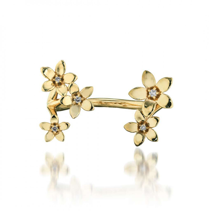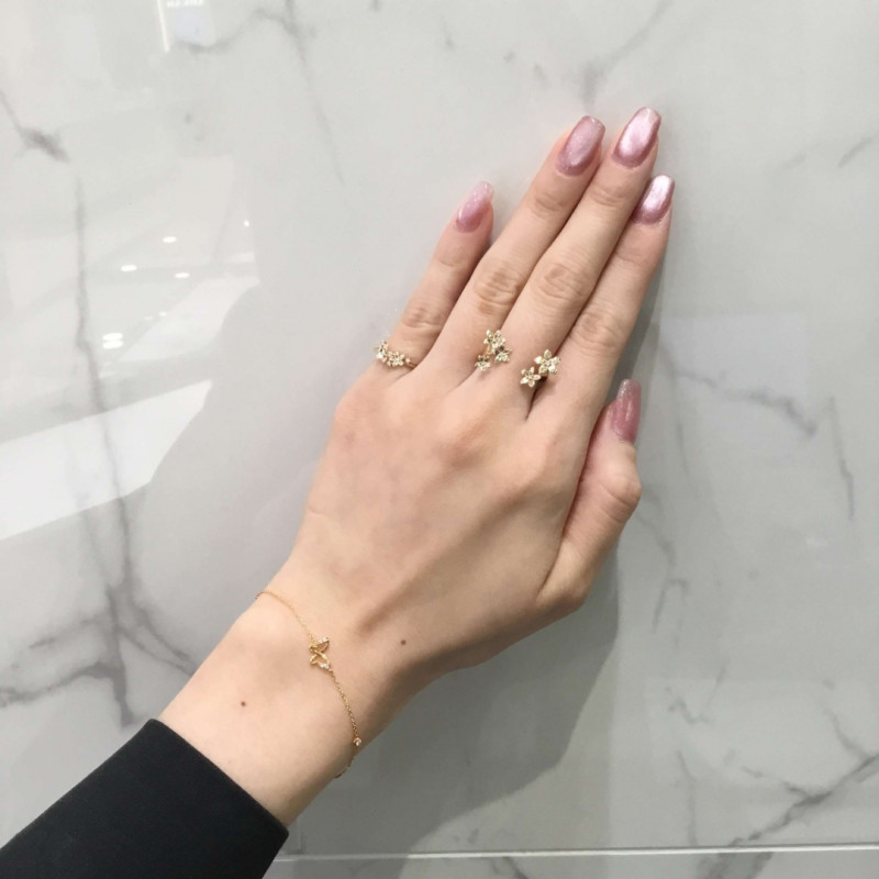 花の中心やその合間には、ダイヤモンドを「星留め」でセッティング。まるで星のブーケを纏っているかのように、可憐で繊細な花々が手元を華やかに彩ります。