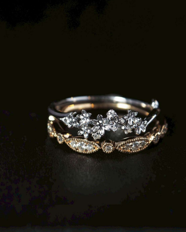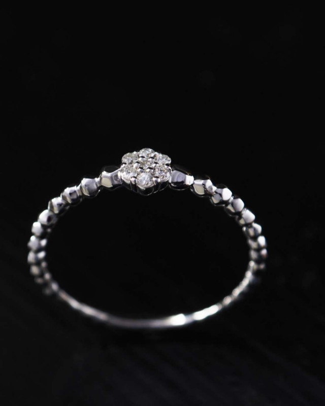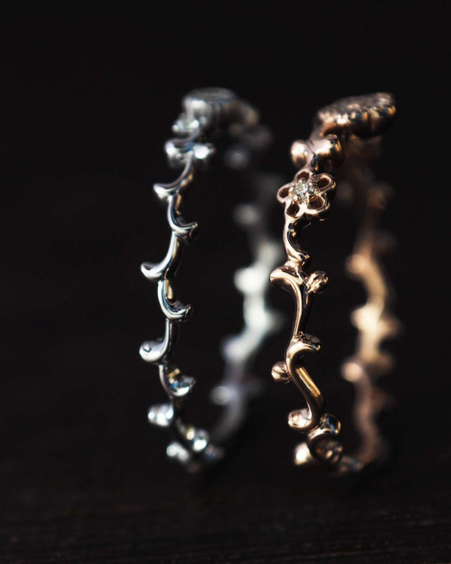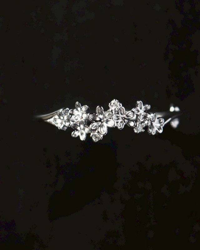 軽やかな葉の意匠には、澄んだ輝きをもつホワイトゴールドを。エッジに光が宿り、輪郭がすっと立ち上がります。