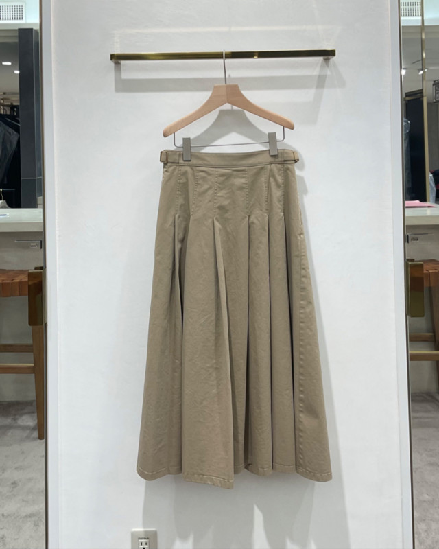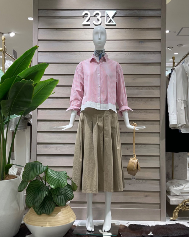 CANCLINIのストライプシャツにストレッチギャバのタックフレアスカートを合わせた軽やかな春のスタイリングをご提案いたします♪
