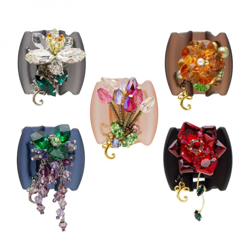 スワロフスキー®・クリスタルで描く立体的な花モチーフのきらめきが、装いを瑞々しく華やかに彩ります。