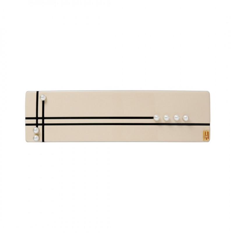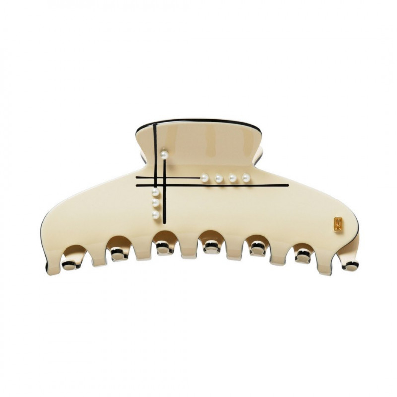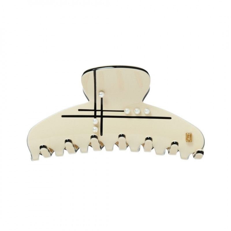 幾何学的なデザインがユニークなクリップとバレッタ。アイボリー×ブラックの人気定番カラーボディには、クラフトマンシップが光る彫りの技術とスワロフスキー®・パールを施し、知的でモードなデザインを堪能できます。